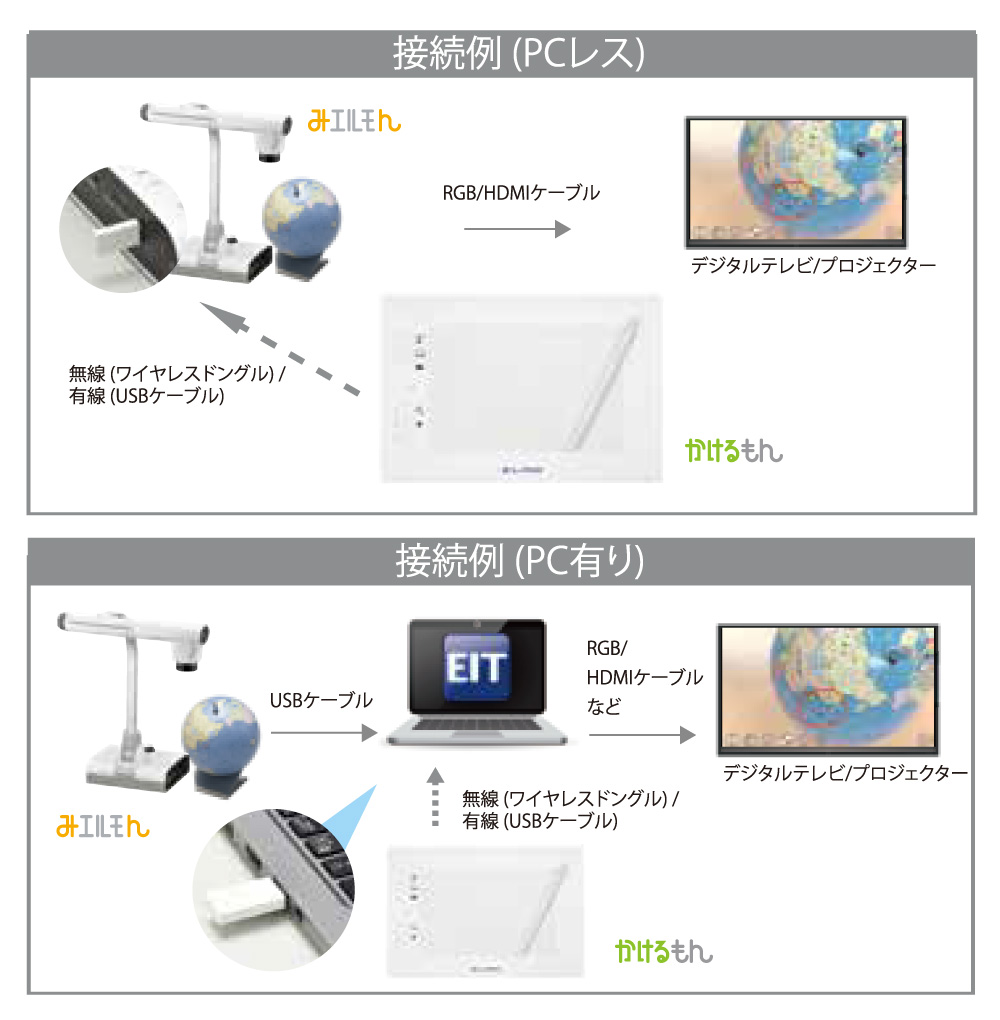 「書画カメラ(みエルモん)」×「かけるもん」で、教室内のどこからでもデジタルテレビやプロジェクタの大画面に書き込み可能。