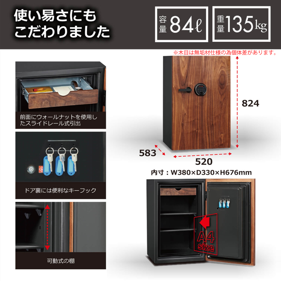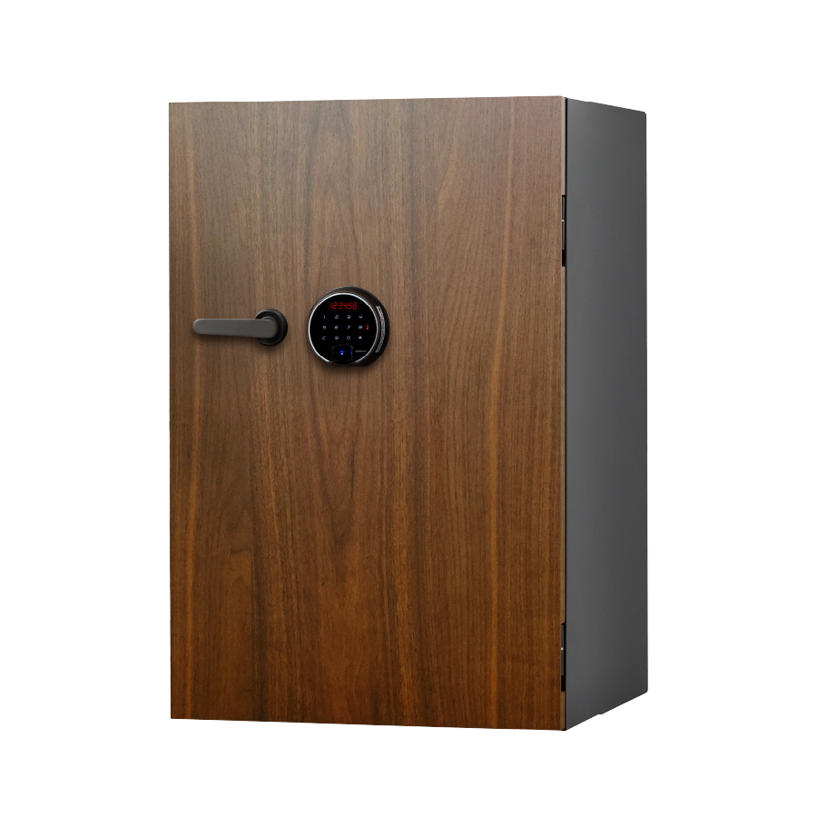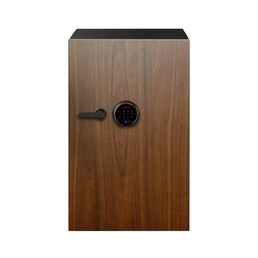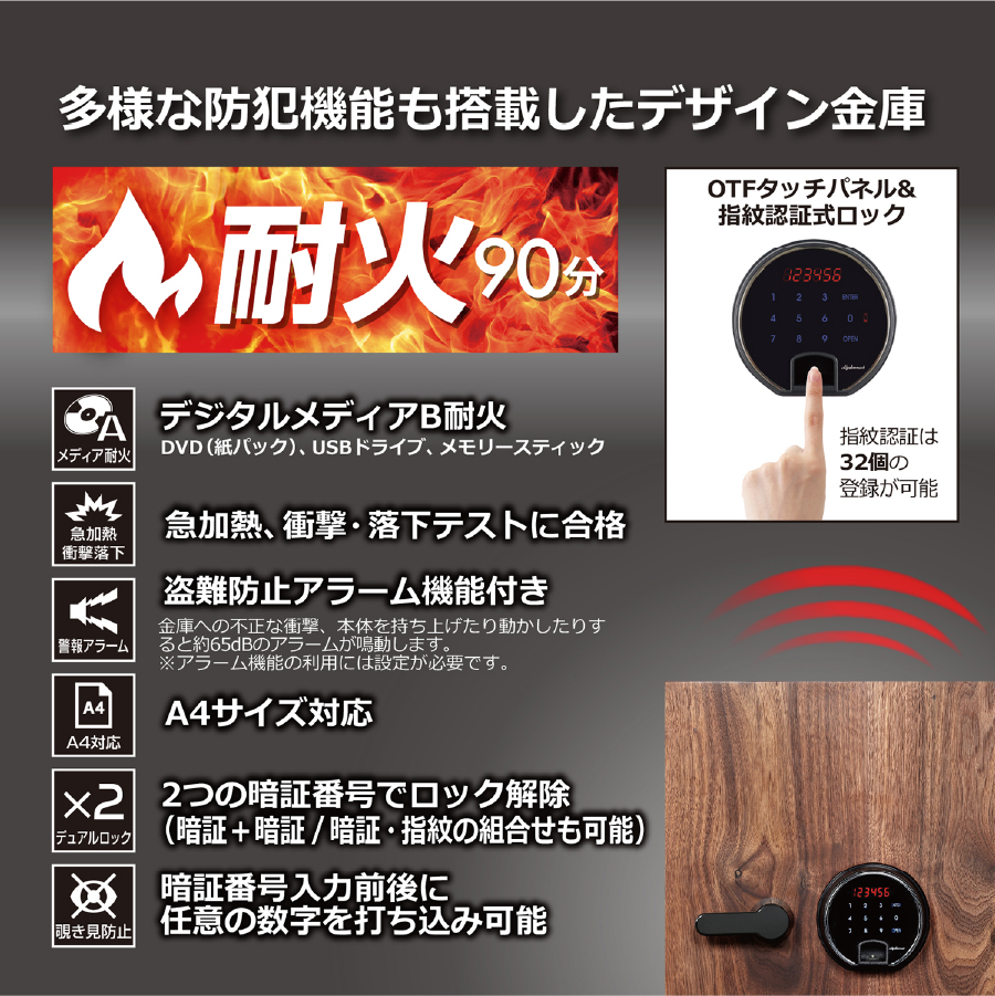 指紋認証/タッチパネル式テンキーの便利な2WAYロックシステム。耐火性能とセキュリティ機能を備えたインテリア性の高い金庫。