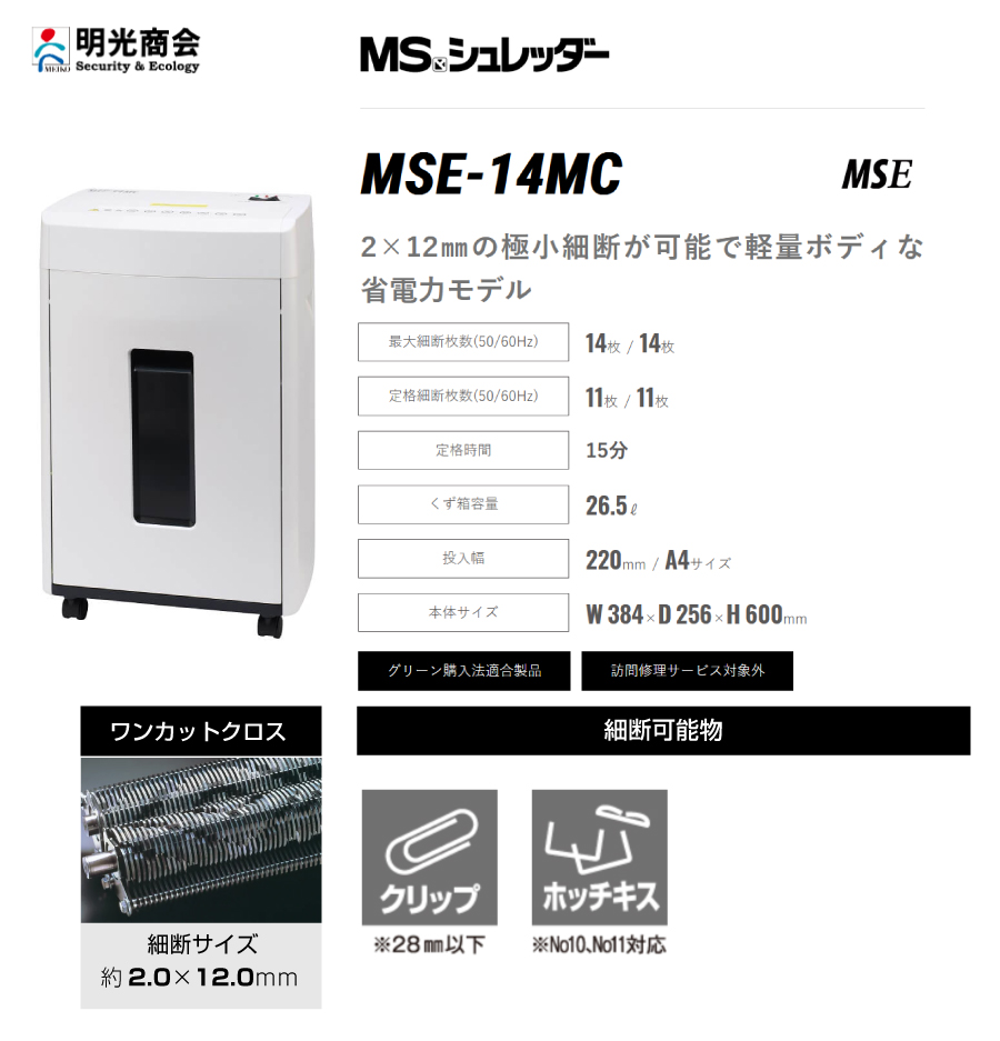 |細断寸法:約2×12mm |開封品[箱破れ] 明光商会 MSシュレッダー MSE-14MC オフィスパーソナル小型タイプ