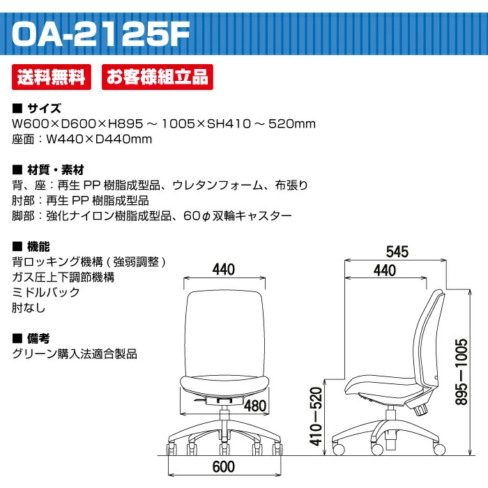 生興 オフィスチェアー 肘なし ミドルバック|OA-2125F