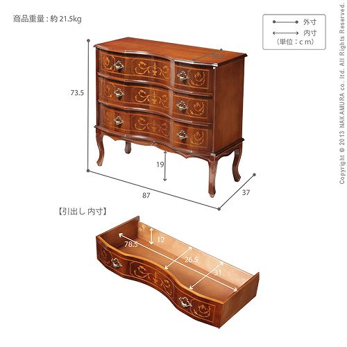 イタリア 家具 ヨーロピアン ヴェローナクラシック 猫脚3段チェスト W87cm (42200001)|ナカムラ|