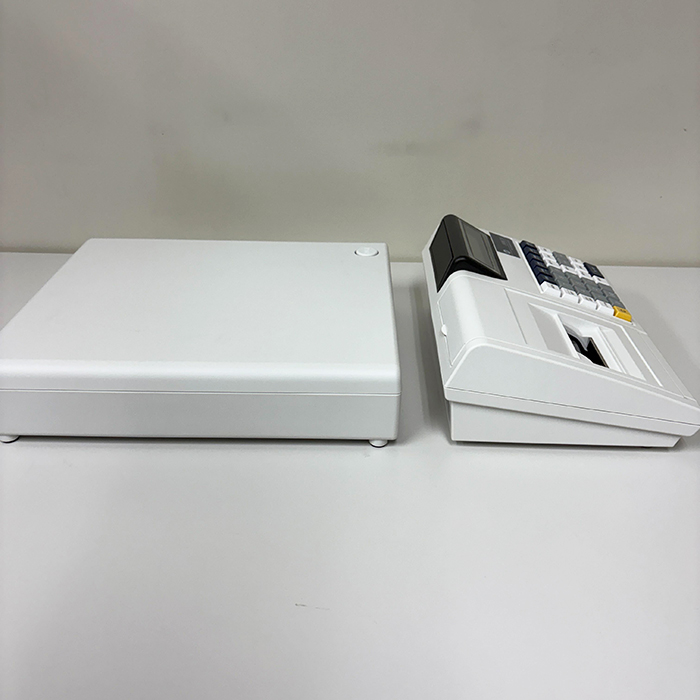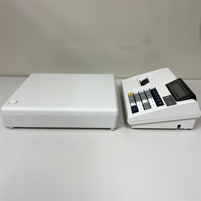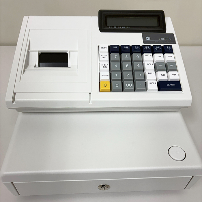 ロール紙付で届いてすぐ使えます。本体とドロアが分離可能で、設置場所の柔軟性があります。4部門の売上分類に対応し、課税・非課税の設定も部門キーに割り当てられます。