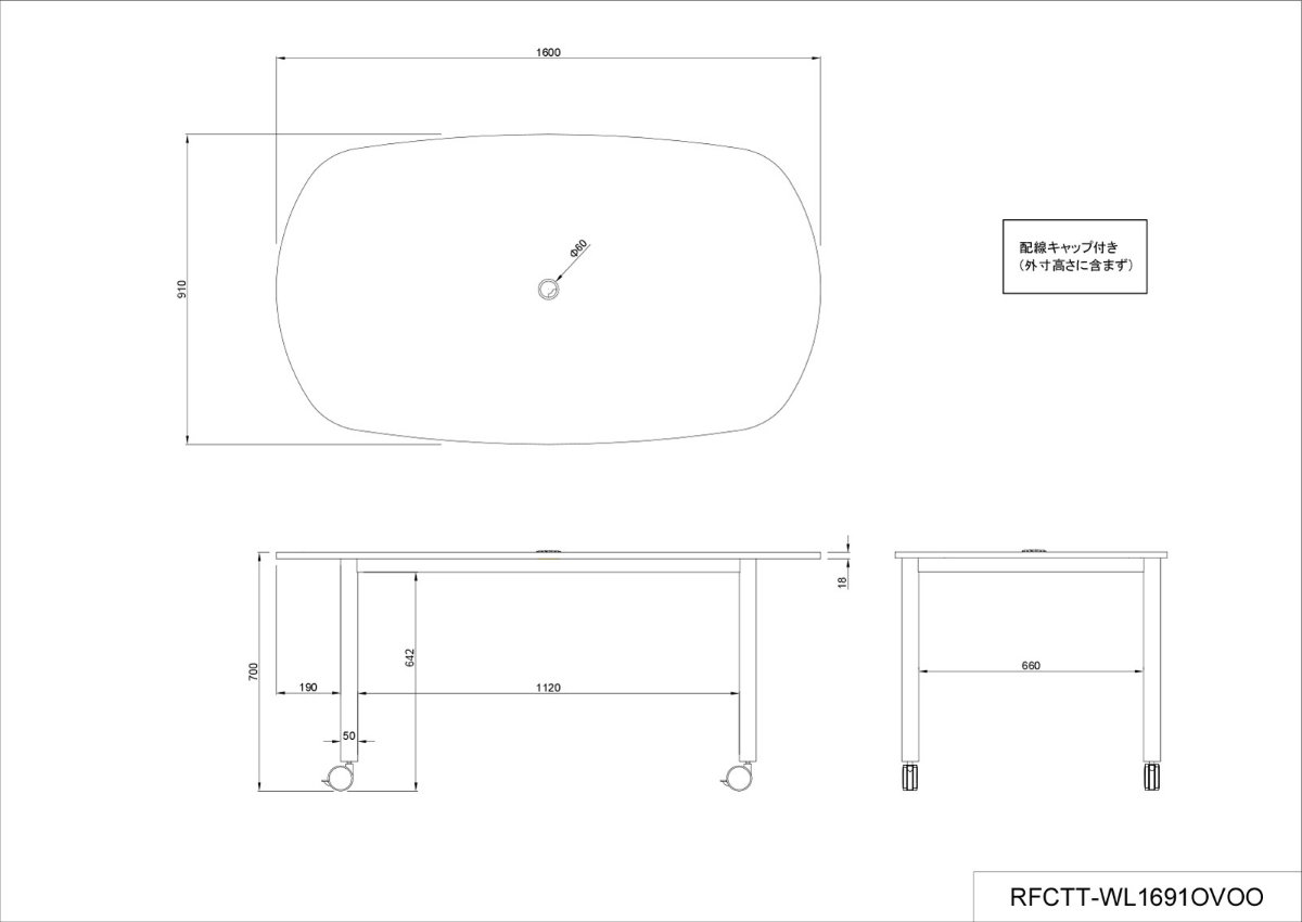 アール・エフ・ヤマカワ キャスターテーブル ホワイト脚 オーバル ナチュラル RFCTT-WL1691OVNA