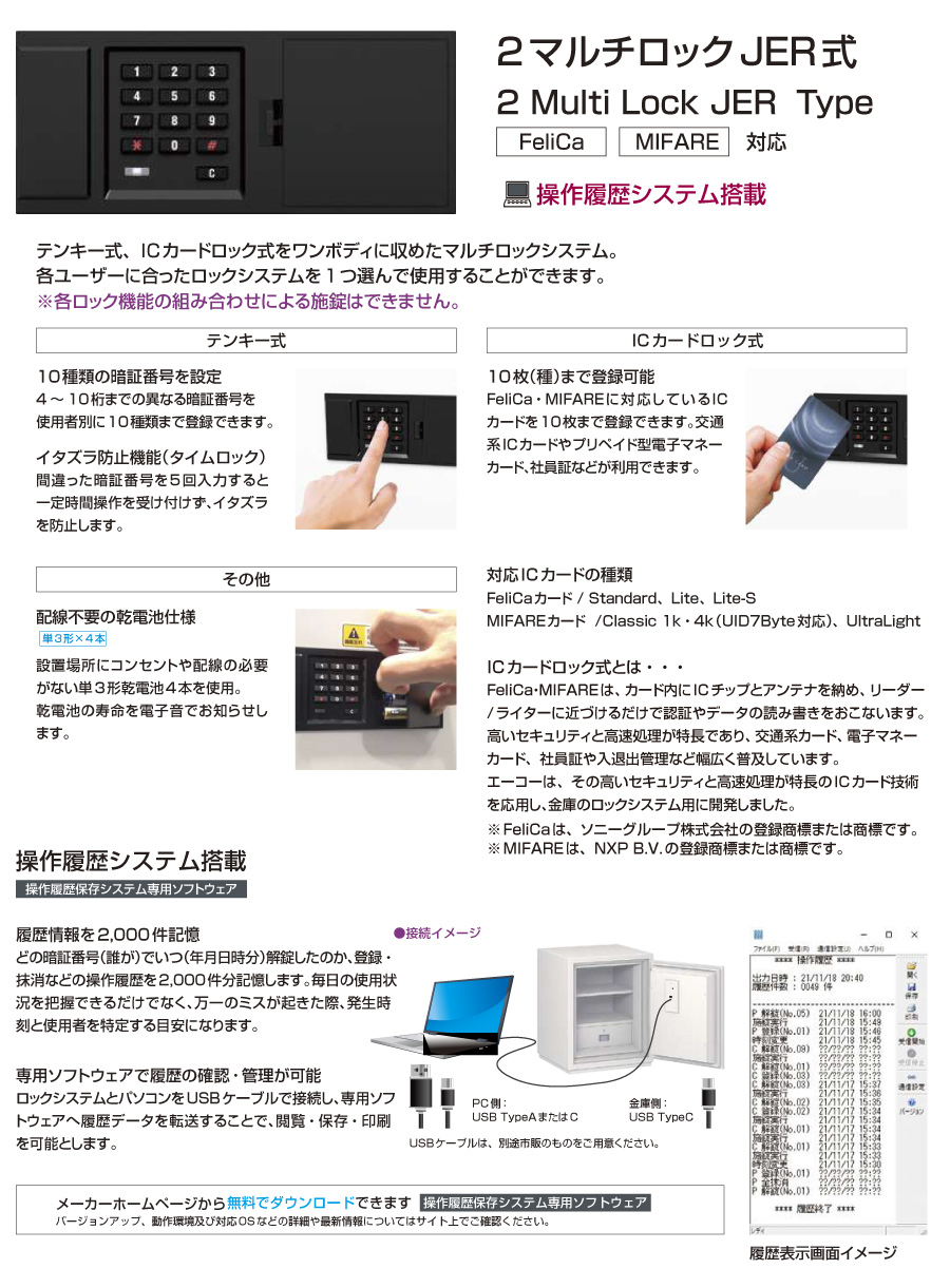 また、テンキー式+ICカード式の2マルチロックで、操作履歴データの保存も可能です。