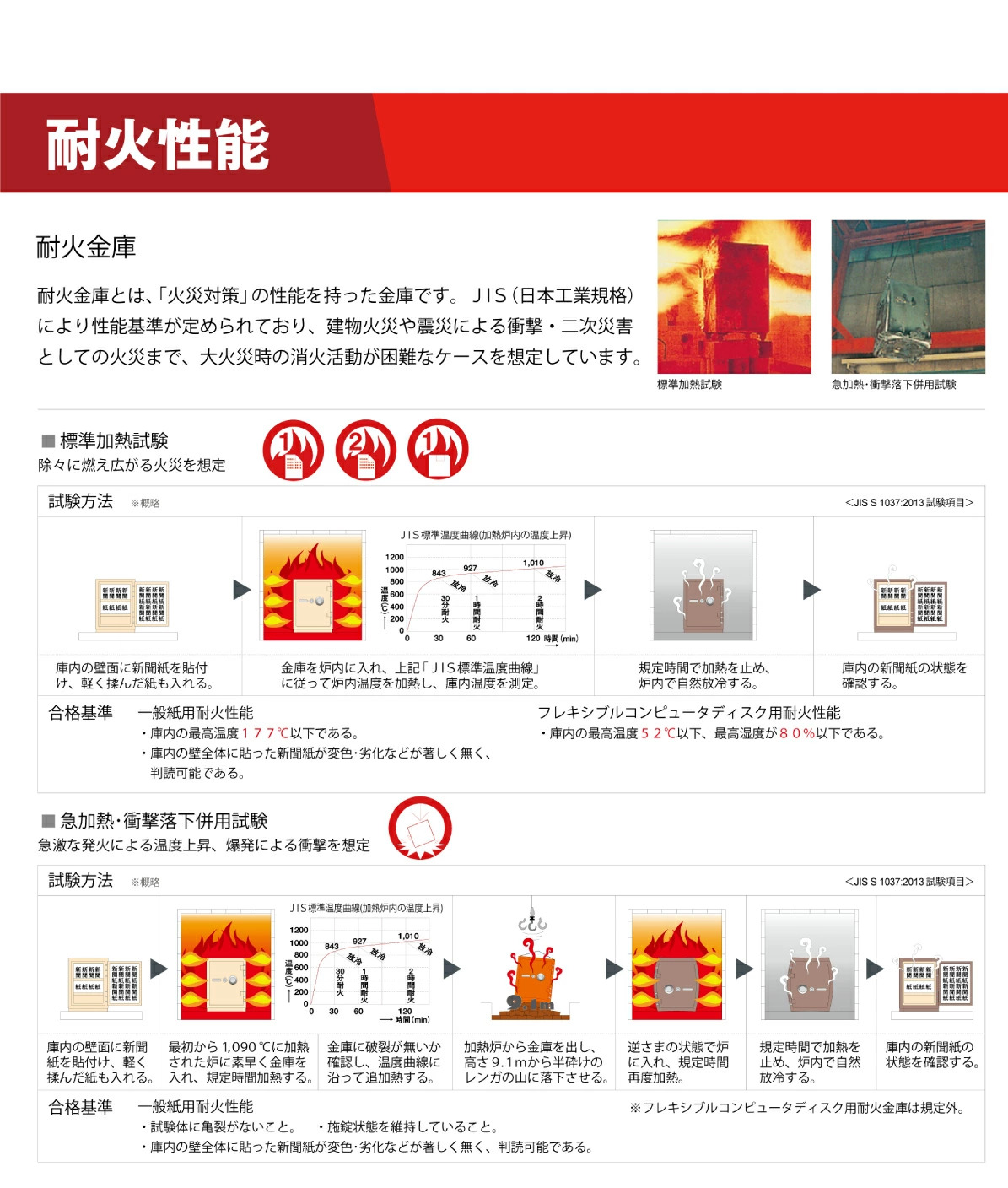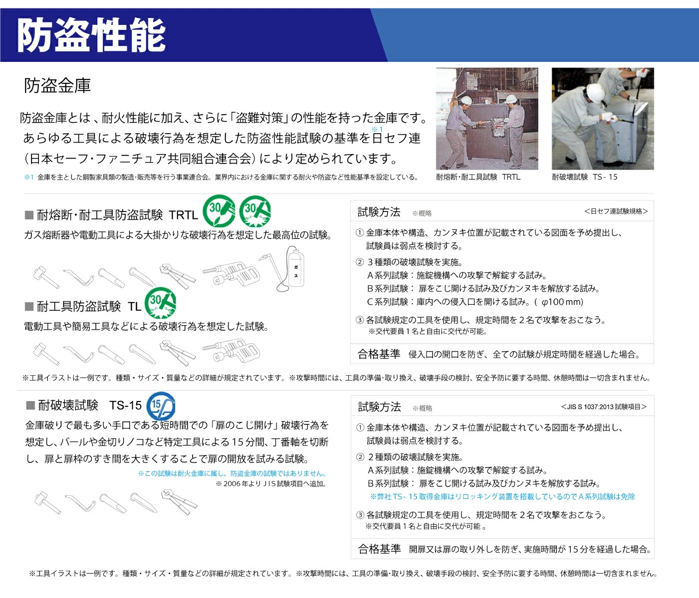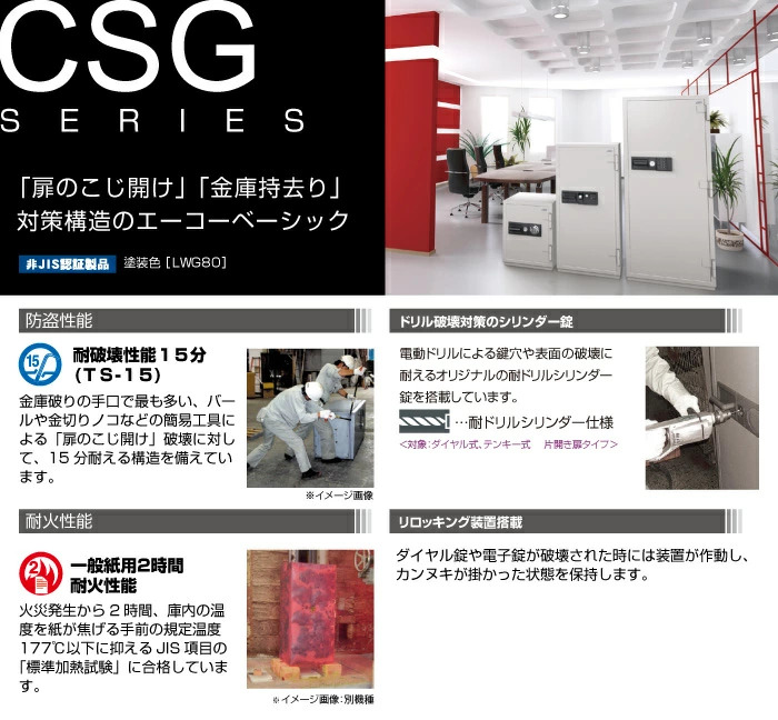 一般紙用2時間耐火性能、および破壊行為(扉のこじ開け)に耐える“耐破壊性能15分(TS-15)”を備えている金庫です。