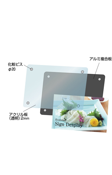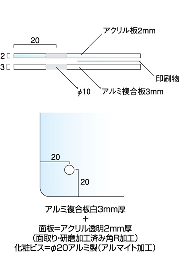 ●面板=前面:アクリル透明2mm厚(面取り・研磨加工済み・角R加工) 背面:アルミ複合板白3mm厚(面取り・角R加工)