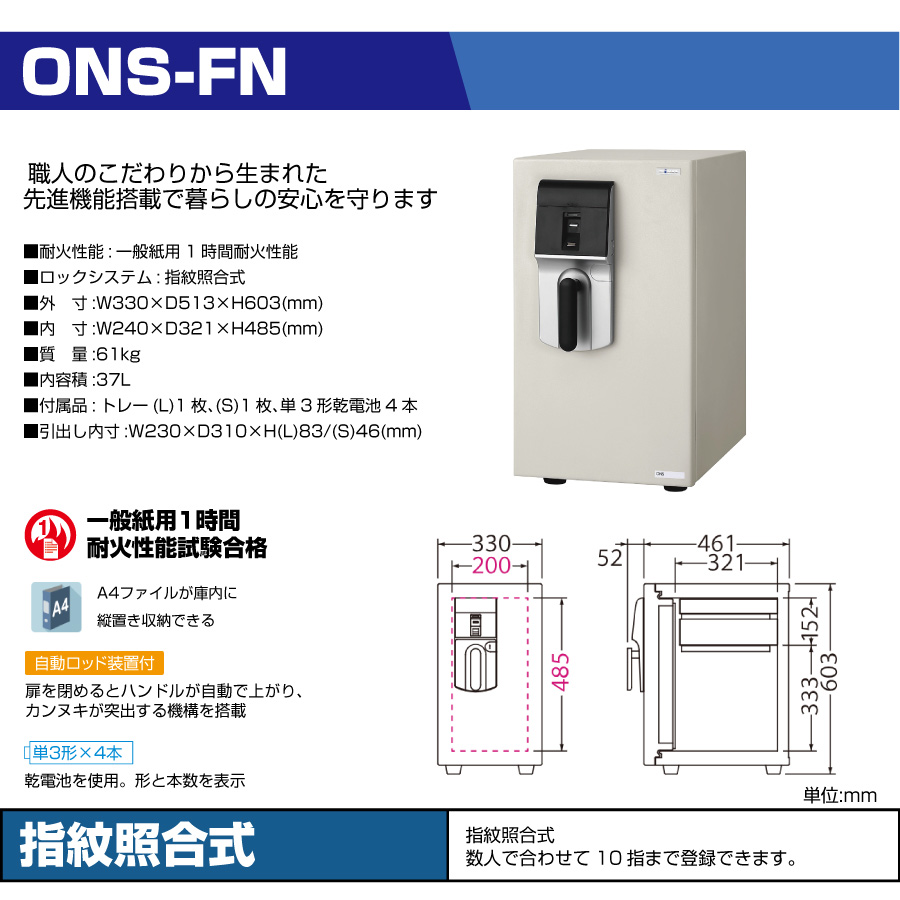 エーコー 指紋認証式 耐火金庫 ONS-FN 準耐火時間1時間