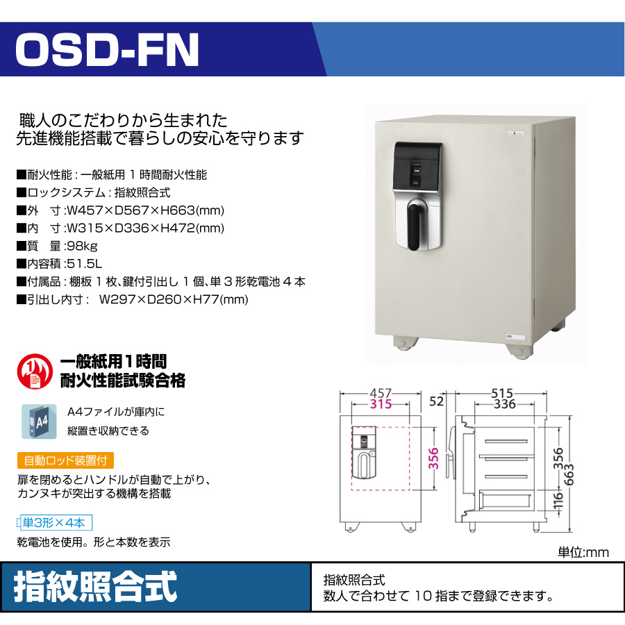 エーコー 指紋認証式 耐火金庫 OSD-FN 準耐火時間1時間