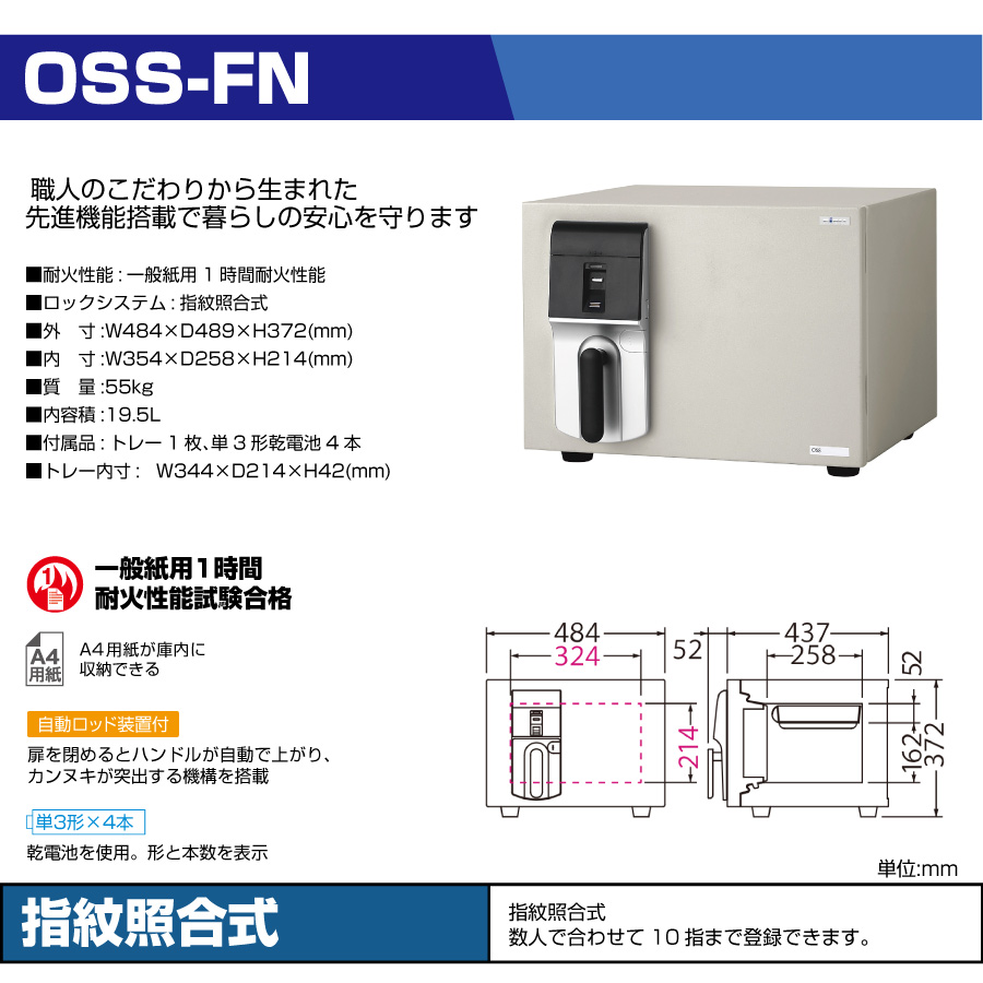 エーコー 指紋認証式 耐火金庫 OSS-FN 準耐火時間1時間