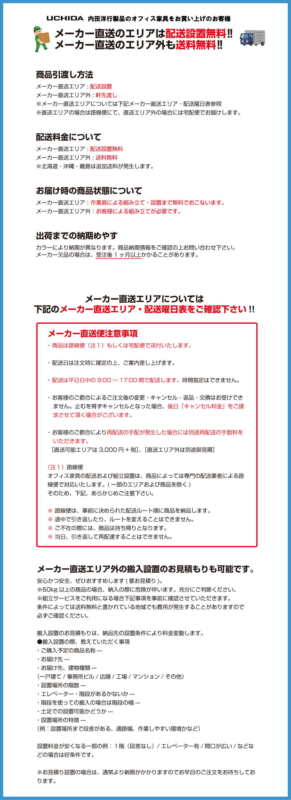 [メーカー直送エリア内]は配送設置(無料)。作業員が商品組立てを行います。